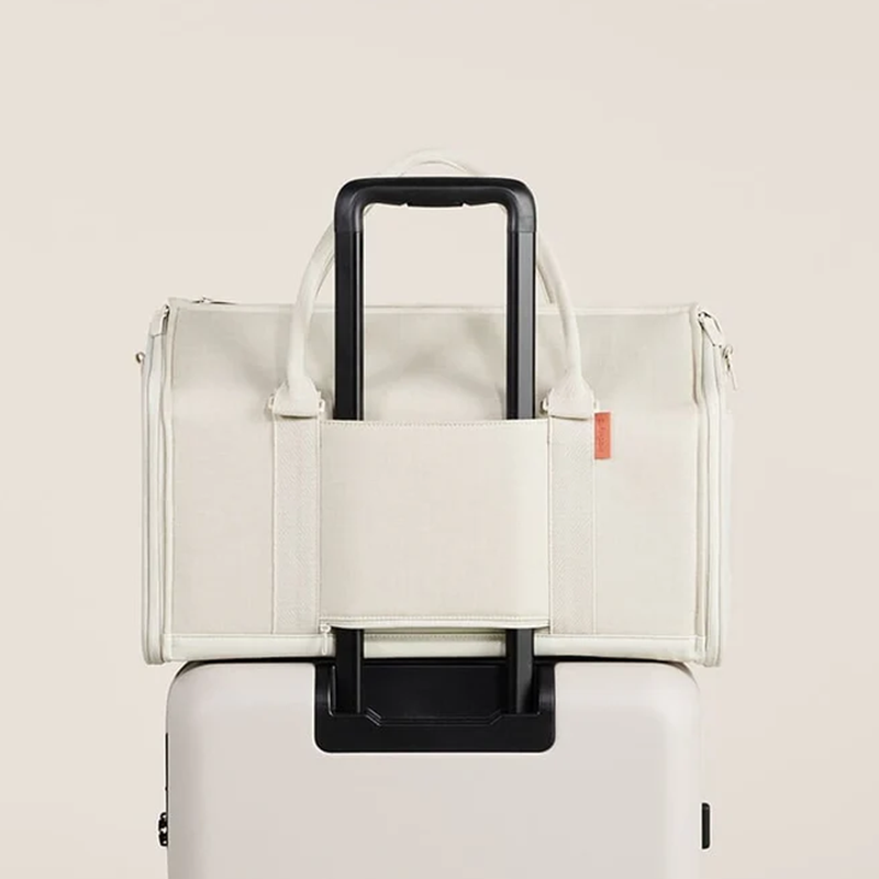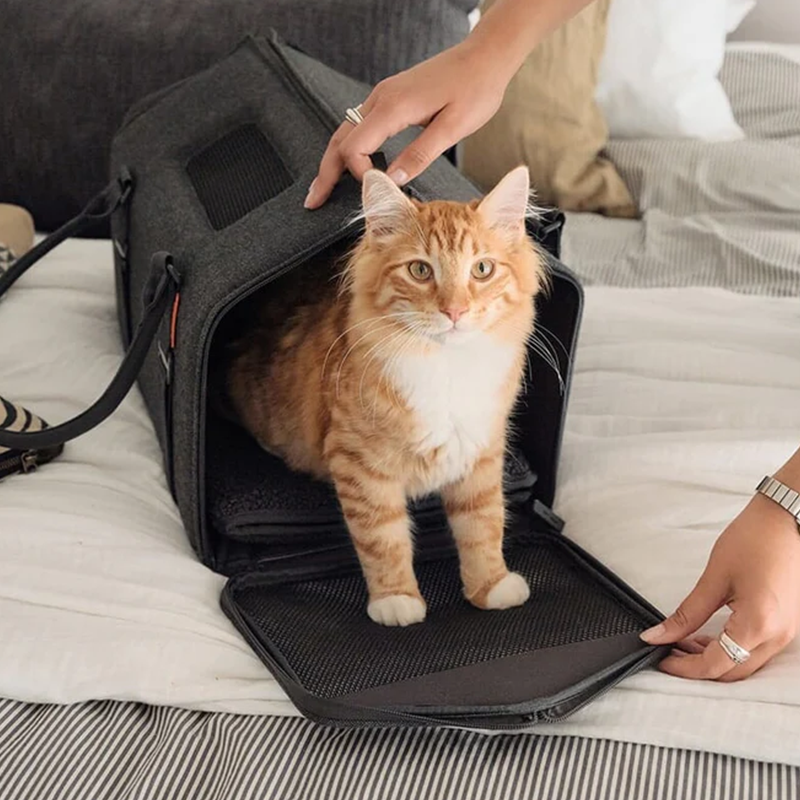 Once you've reached your destination. in just a few quick zips the carrier transitions into a home away from home. complete with removable faux shearling bedding. The Cat Carrier also boasts multiple entry options. secure pockets for essentials. and hidden structural panels for added stability.