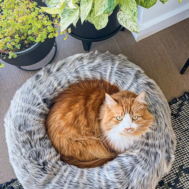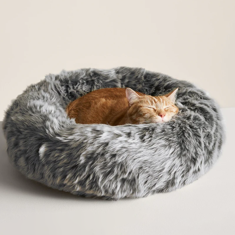 Soft faux fur and a compact size make this the perfect place to curl up and relax. The is equally well-suited to being your cat's regular bed or an additional cozy place to nap on the floor. table or sofa. An ultrasuede base prevents the bed from sliding on surfaces.Size: